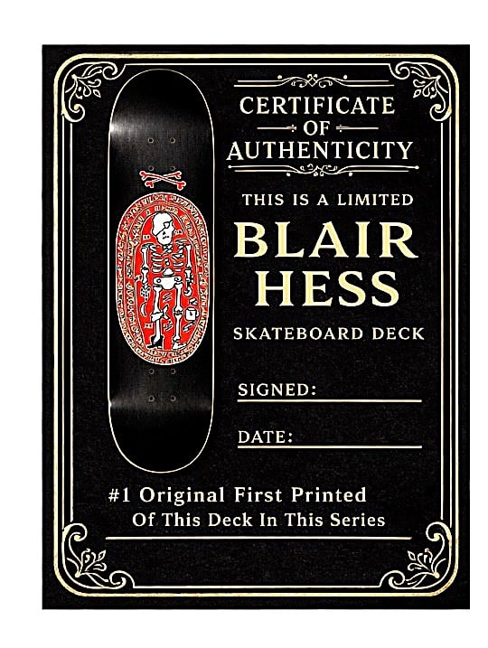 This is a limited print skateboard deck 8.25 wide .Made from 7 ply maple hard wood. Great to skate or display featuring art from skateboarder / artist Blair Hess . Comes sign and numbered with a certificate of authticity and stickers . There are only 60 made in this colorway. Once you put in an order it will take 2 weeks to produce and be shipped out . Once it is ready to be shipped out an email will be sent with a tracking number . The photo shows example of what it is. No returns on limited items
